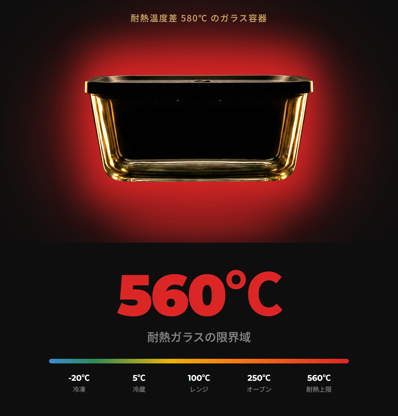 冷凍保存からオーブン調理まで、容器を移し替える必要がありません。採用している高ホウケイ酸ガラスは、耐冷-20℃・耐熱560℃と幅広い温度域に対応。急加熱・急冷却にも強いプロユース品質のガラス素材です。