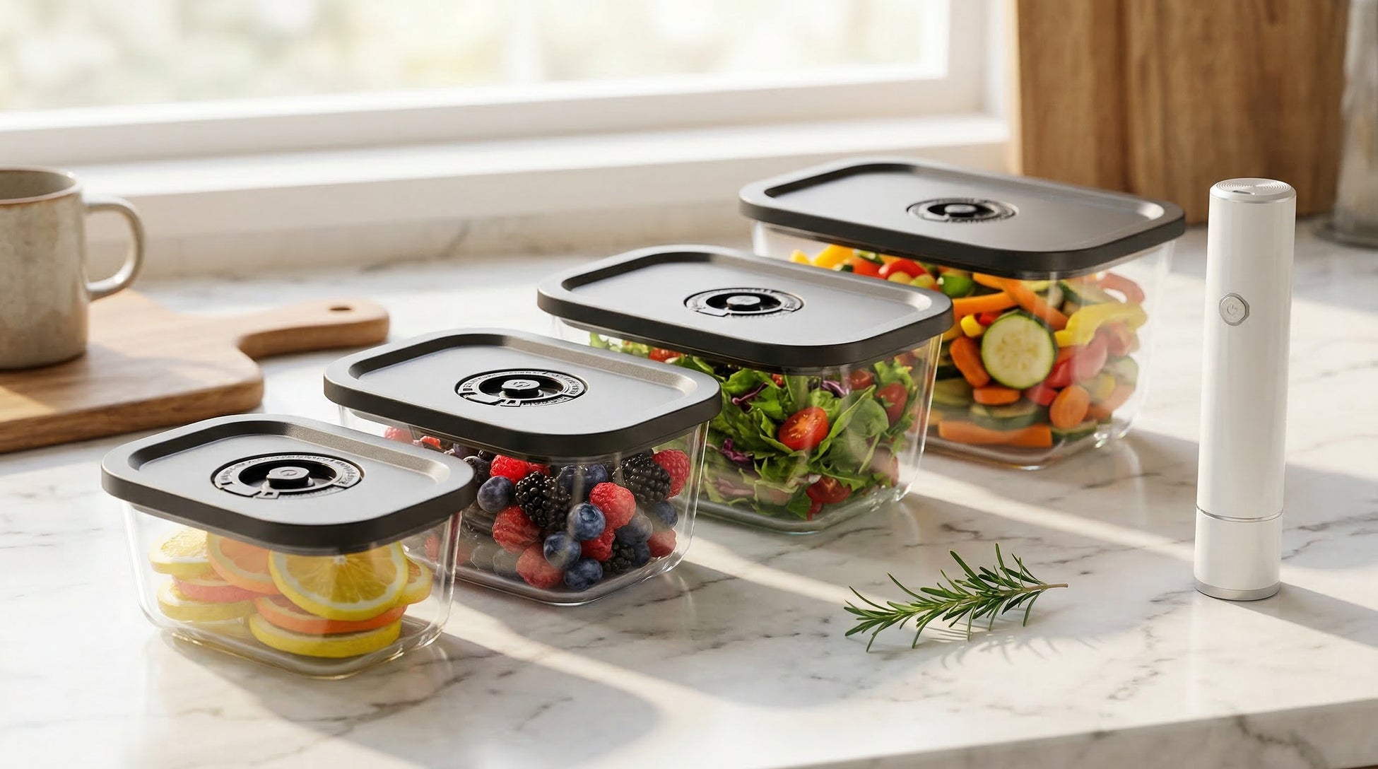 冷凍からオーブンまで容器ひとつで完結する、プレミアム真空保存システム。日曜の仕込みを、金曜の食卓までおいしく届ける。