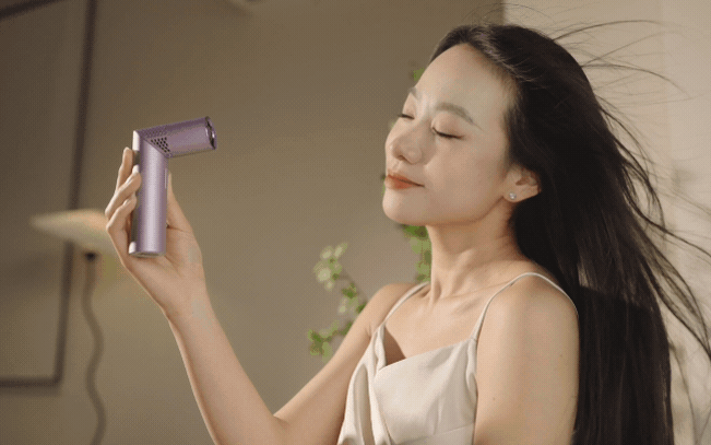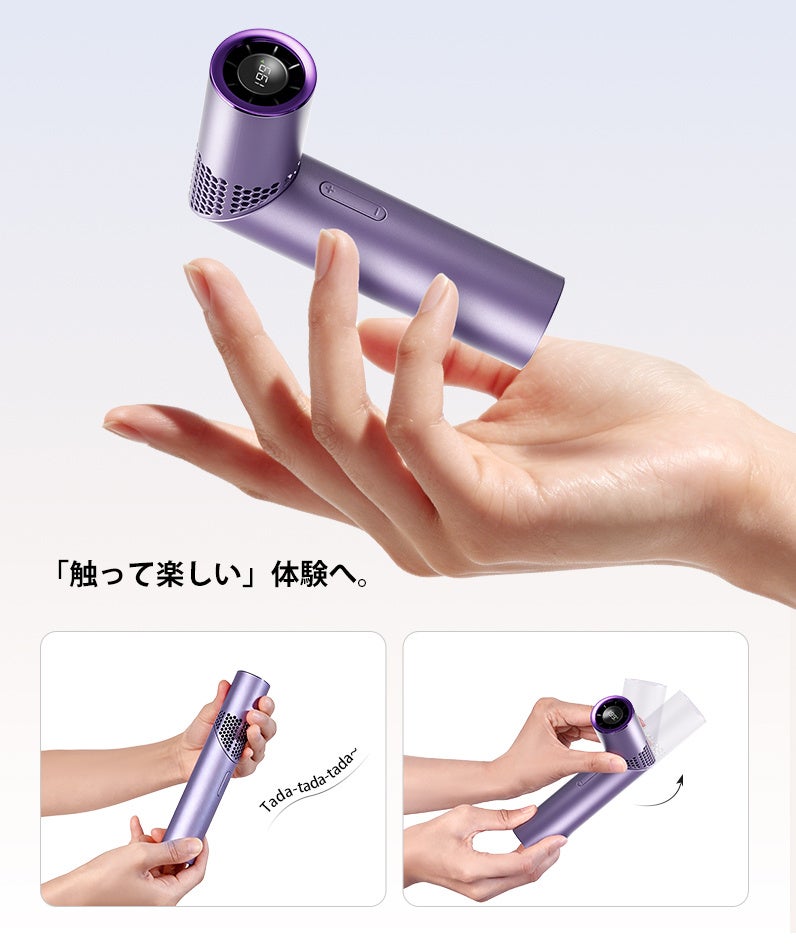 「LIP FAN」はまるでリップのように、ポケットにもバッグにもすっと収まる。さらに、90°無段階の角度調整に対応。卓上でも、手持ちでも、シーンに合わせて“ちょうどいい風”を届けます。そして、隠し羽根デザインを採用し、最大20,000RPMの高速回転と、最大風速13m/sのパワフルな送風を実現。コンパクトな見た目からは想像できない、驚きの風力。