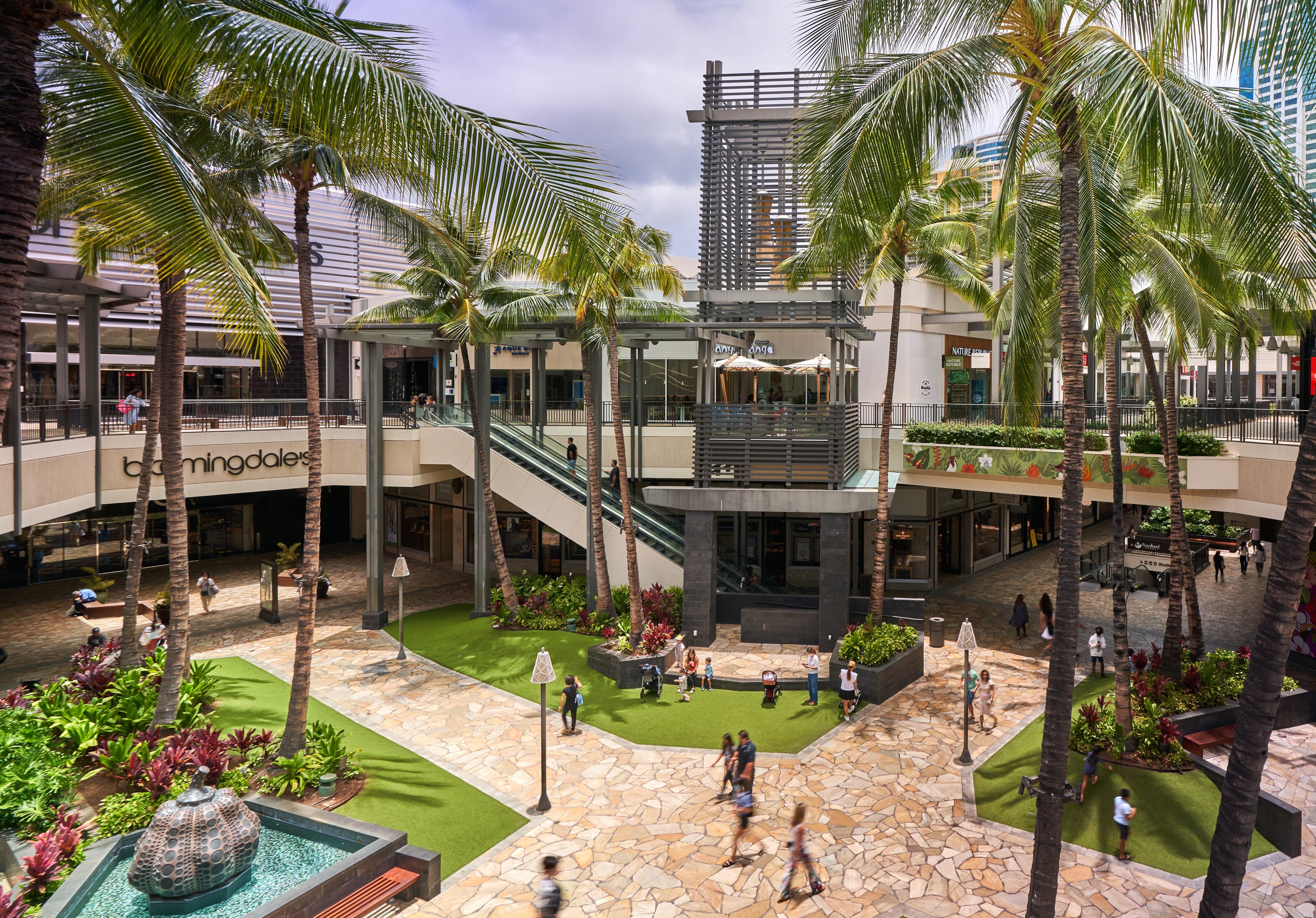 太平洋の中心、ハワイ州のホノルルに位置する世界最大規模のオープンエア・ショッピングセンタ 「アラモアナセンター」は、1959年に開業して以来、ショッピングや交流の拠点として多くの地元民と観光客で賑わいを見せています。240 万平方フィート(約 223,000 平米)の売り場面積を誇る同センターには、ブルーミングデールズ、ノードストローム、メイシーズ、ターゲットをはじめ、世界有数のラグジュアリーブランドや地元経営のブティック、160を超えるダイニング施設など、計350 以上の多彩な店舗が軒を連ね、毎年延べ 5300 万人が訪れています。アラモアナセンターには「海への道」という意味があり、その名の通りアラモアナ・ビーチパークのすぐ近くに位置しています(1450 Ala Moana Boulevard Honolulu, Hawaii 96814)。