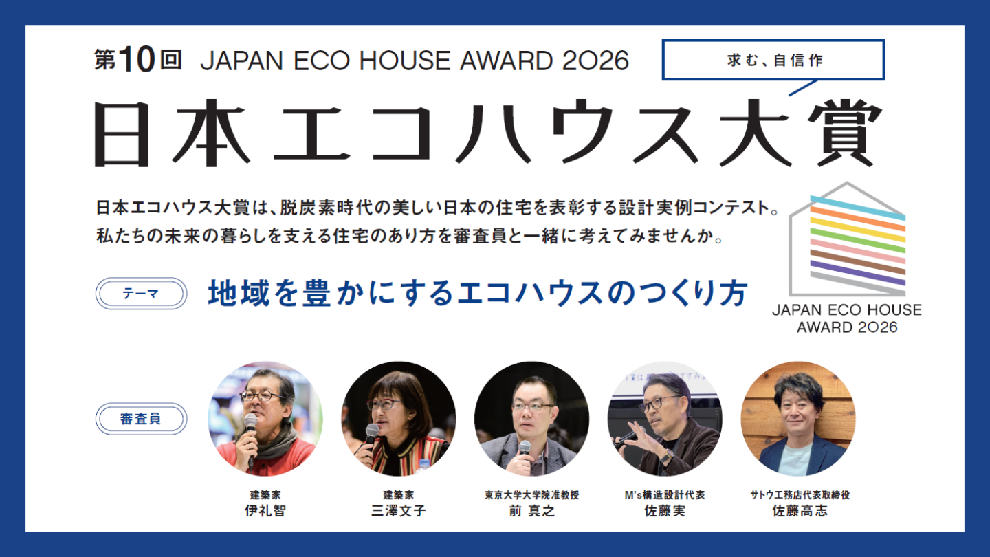 第10回という節目を迎える今年も、日本エコハウス大賞では、高い省エネ性能と意匠を両立した住宅実例を全国から募集します。断熱・気密・省エネ性能を高めながら、住まい手の暮らしを豊かにする設計。地域の気候風土を読み解き、自然の力を生かすパッシブデザイン。長く住み継がれる美しい住宅。これからの日本の住まいづくりをリードする、優れた住宅実例の応募をお待ちしています。