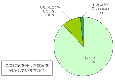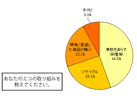 全体の88.1%、1,299人がエコに気を使った試みを「すでに行っている」と答えており、エコを意識することが生活の一部となっていることがうかがえます。具体的な取り組みとしては、節電、節水など無駄を減らす(44.5%)、環境に配慮した商品の購入(22.2%)、リサイクル(25.2%)、環境に配慮した商品の購入(22.2%)、手作り(8.0%)と続きました。