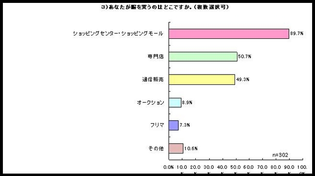 最も多かったのは「ショッピングセンター・ショッピングモール」。続いて2位が「専門店」、3位に「通信販売」のような結果となりました。ショッピングモールや専門店のリアル店舗と、通信販売を利用しているようです。
