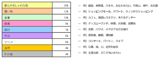「買い物」では、洋服、雑貨などを買いにいく目的の他に、ウィンドウショッピングという回答が多く見受けられました。一緒に買う、または買ってもらうということに固執しているのではなく、女同士で趣味や可愛いと思うものを共有することも買い物という回答に含まれておりました。