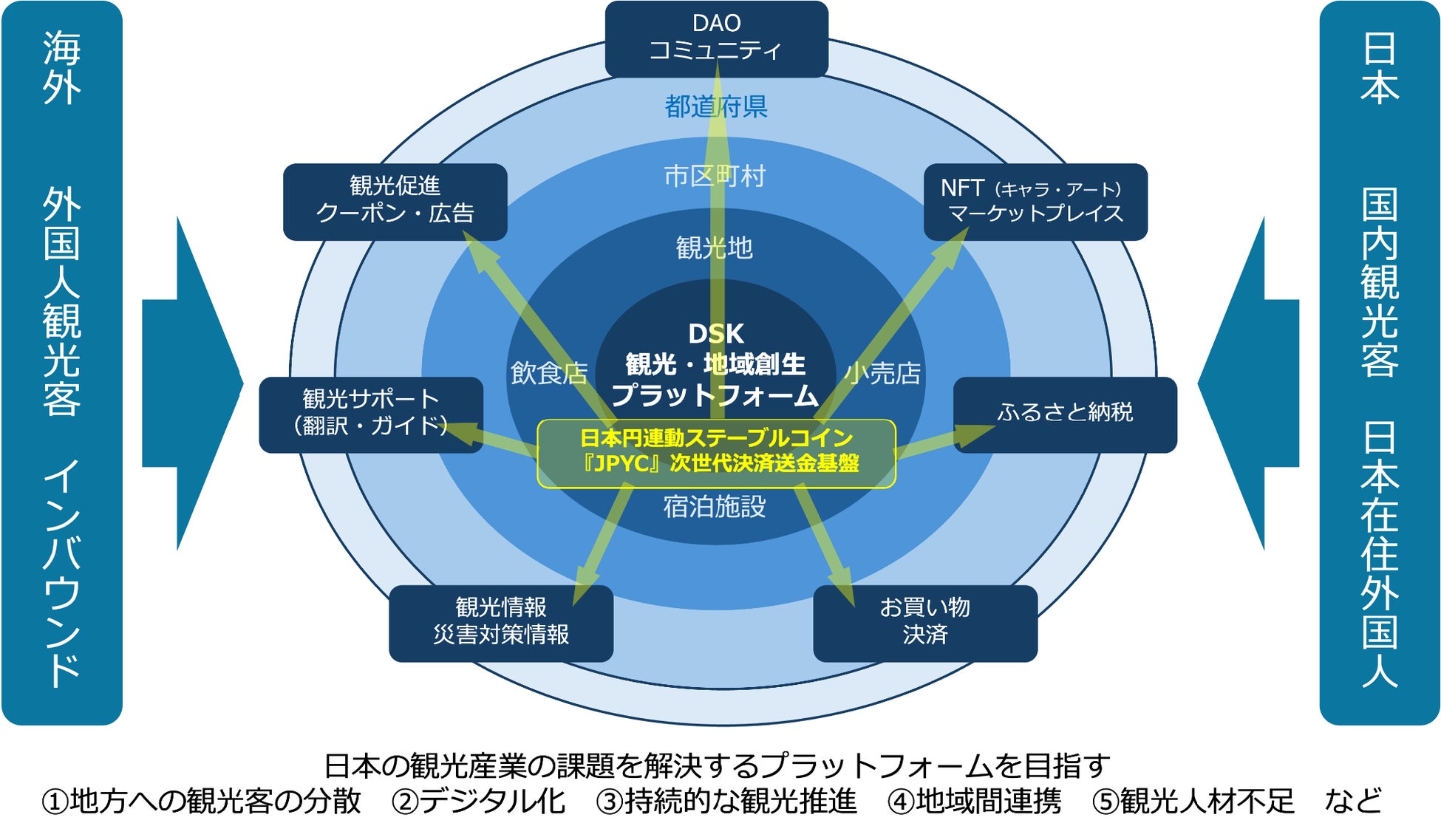 今回は、この構想の第二弾の協業として、上記2.に記載の『JPYC』次世代決済送金サービスの観光産業へ普及、DAO (*7) コミュニティの運営、NFTやふるさと納税の決済、観光ガイドや翻訳サービスを提供する個人・団体への支払い、観光促進クーポン発行、などあらゆる決済・利用シーンに『JPYC』が本プラットフォームの基盤となるべく、JPYC社に観光・地域創生プラットフォーム事業へ参画いただき、共に活動してゆきます。