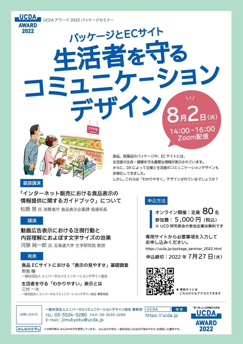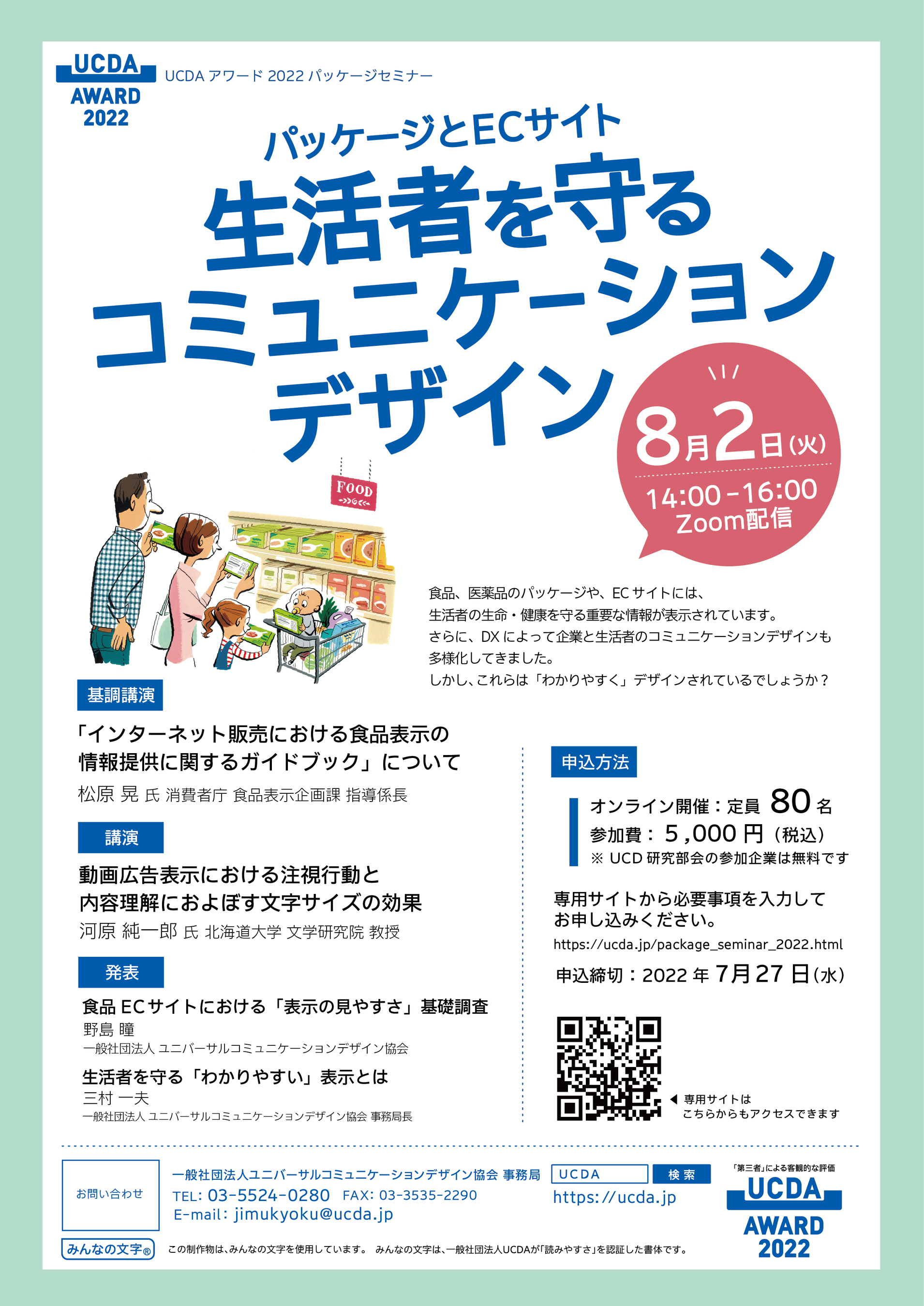 今回の「UCDAアワード2022 パッケージセミナー」は消費者庁食品表示企画課の松原晃様と北海道大学文学研究院教授の河原純一郎様をお招きして、「パッケージとECサイト、生活者を守るコミュニケーションデザイン」として開催します。また、UCD研究所からは食品ECサイトにおける「表示の見やすさ」基礎調査の発表をします。