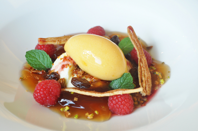 ホワイトチョコのムースとアールグレイのジュレを合わせた優しい甘みの中に、杏のシャーベットやラズベリー、ミントを添えることで、すっきりとした後味に仕上げました。