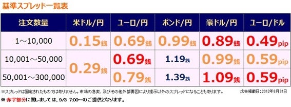 SBI FXトレードが提供する外国為替証拠金取引「SBI FXTRADE」は、2012年9月3日(月)午前7時より、ユーロ/ドル0.49pip(1万通貨注文まで)をはじめとする主要取引通貨ペアの基準スプレッド縮小を実施いたしますのでお知らせいたします。