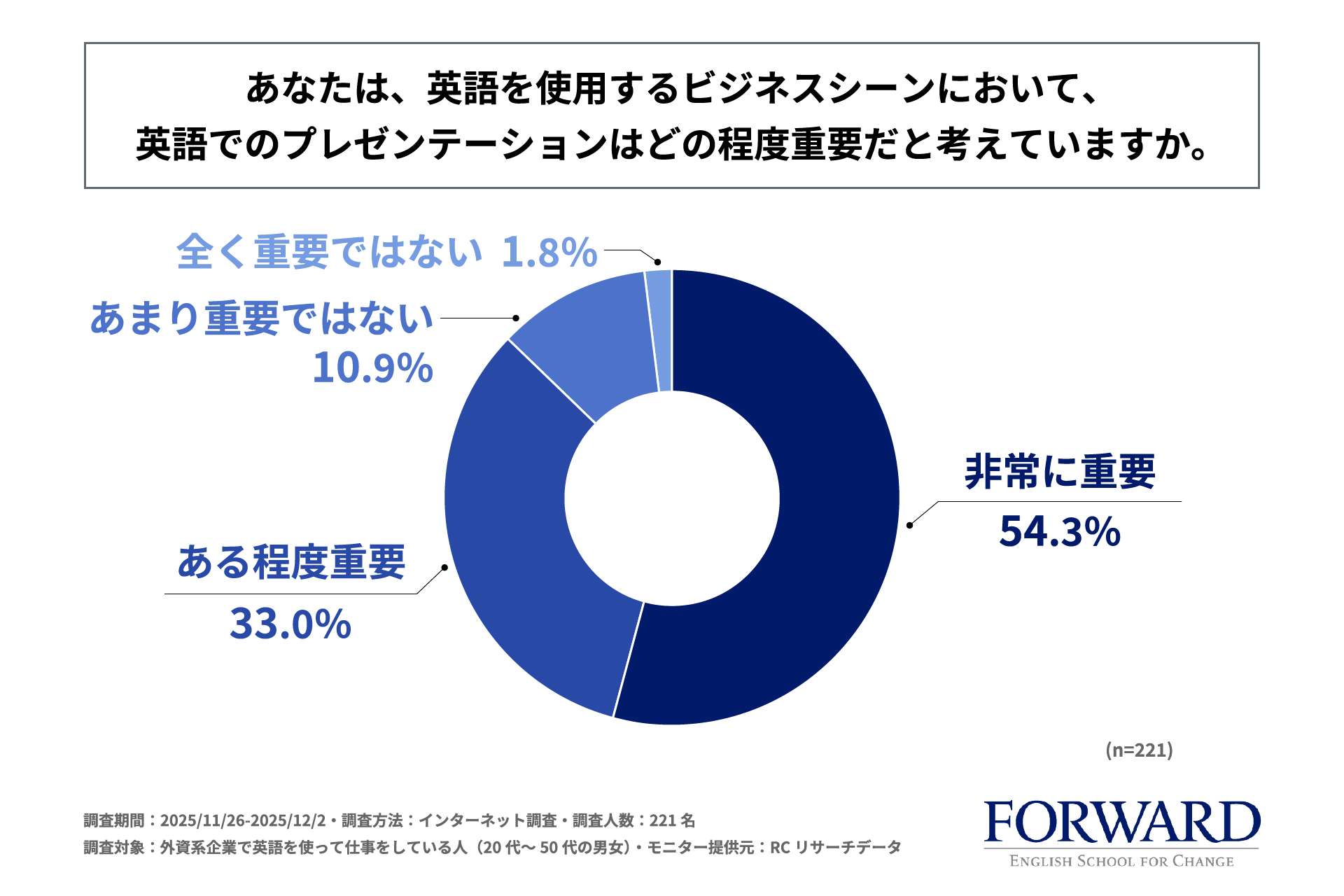 外資系企業や海外との取引が増加している現代において、自身の強みや提案を英語で効果的に伝えるプレゼンテーションスキルへの注目が高まっています。 一方で、実際に外資系企業で働く人々が英語でのプレゼンテーションをどのように認識し、どのような課題に直面しているのか、その実態は十分に解明されていません。 そこで「FORWARD」は、外資系企業で英語を使って仕事をしている人を対象に、「ビジネスにおける英語でのプレゼンテーションに関する調査」を実施しました。