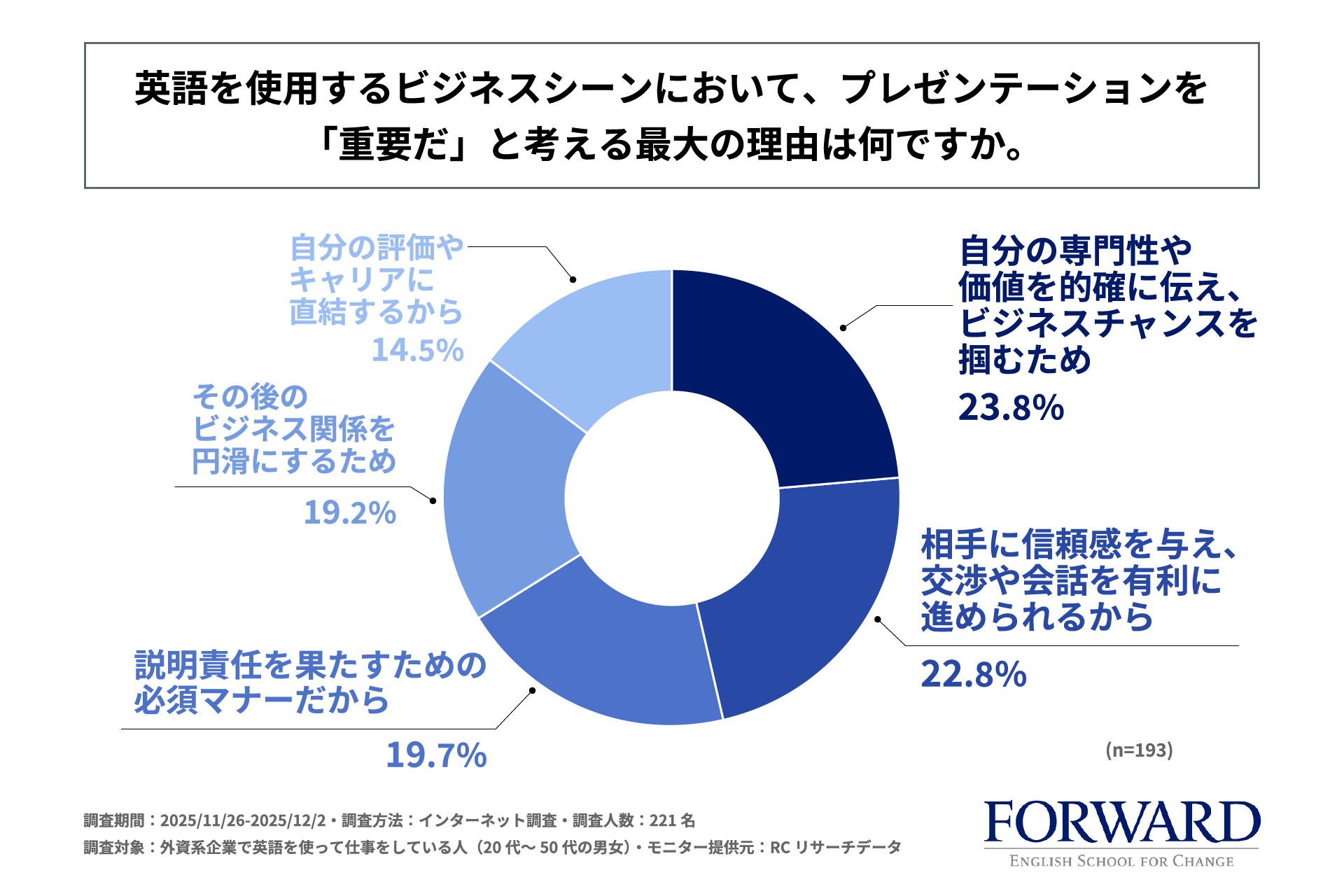 英語を使用するビジネスシーンにおいて、英語でのプレゼンテーションを重要だと考える最大の理由は「自分の専門性や価値を的確に伝え、ビジネスチャンスを掴むため」
