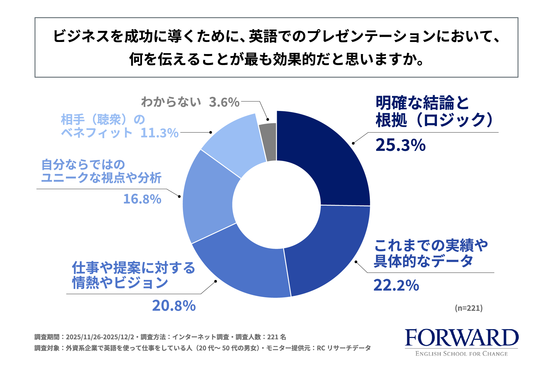 また、外資系企業で英語を使って仕事をしている人を対象に「ビジネスを成功に導くために、英語でのプレゼンテーションにおいて、何を伝えることが最も効果的だと思うか」を尋ねる設問への回答では、1位が「明確な結論と根拠(ロジック)」で25.3%、2位が「これまでの実績や具体的なデータ」で22.2%、3位が「仕事や提案に対する情熱やビジョン」で20.8%という結果になりました。この結果から、外資系企業で英語を使って仕事をしている人が、英語でのプレゼンテーションでビジネスを成功に導くために最も効果的だと考えているのは「明確な結論と根拠(ロジック)」であることがわかりました。