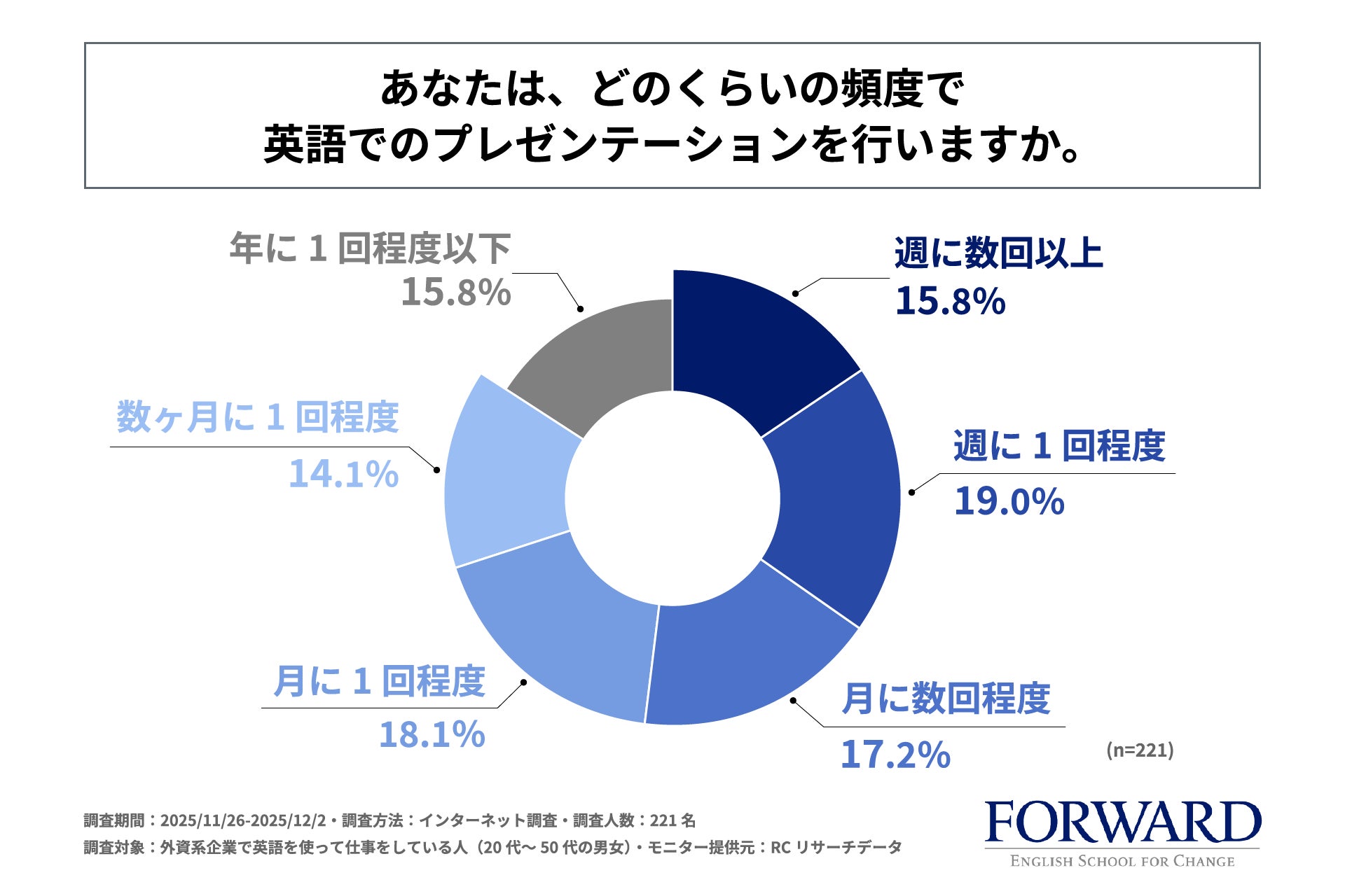 株式会社ランゲージ・ティーチング・レボリューションズ(本社:東京都渋谷区、代表取締役:石渡 誠)が運営する英語学校「FORWARD(フォワード)」は、外資系企業で英語を使って仕事をしている人(20代~50代の男女)を対象に「英語でのプレゼンテーションに関する調査」を実施しました。この調査から、外資系企業で英語を使って仕事をしている人の英語でのプレゼンテーションの実施頻度やその重要性の意識、そして自身のプレゼンテーションにおける課題などが明らかになりました。