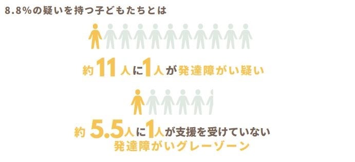 現在、発達障がい・発達障がいグレーゾーンと言われる子どもたちの割合は8.8%*とも言われており増加傾向にあります。