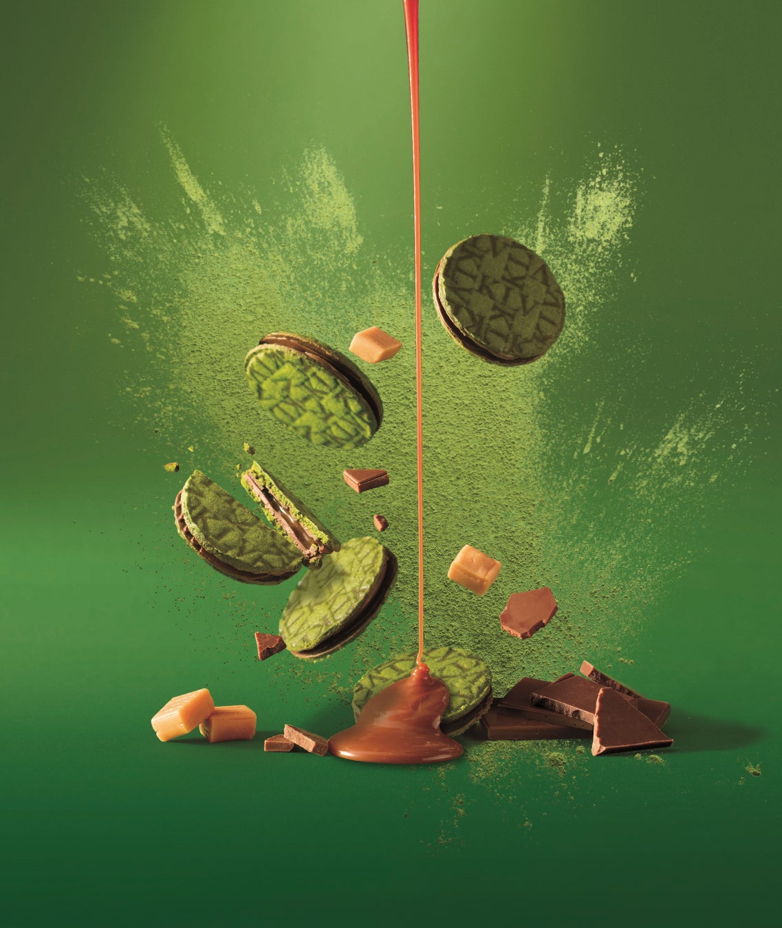 静けさを感じさせる緑を基調とし、商品の円形を庭の飛び石に見立て、リズミカルに配置。枯山水庭園の美意識を表現しています。陽光によって刻々と姿を変える庭園の情趣。その陽光と溢れる情熱と自信の象徴として、シンボリックな紅色としました。「静と動」、「苦味と甘み」。この日本独特の美しさと味わいに、京の濃抹茶の世界観を重ねました。