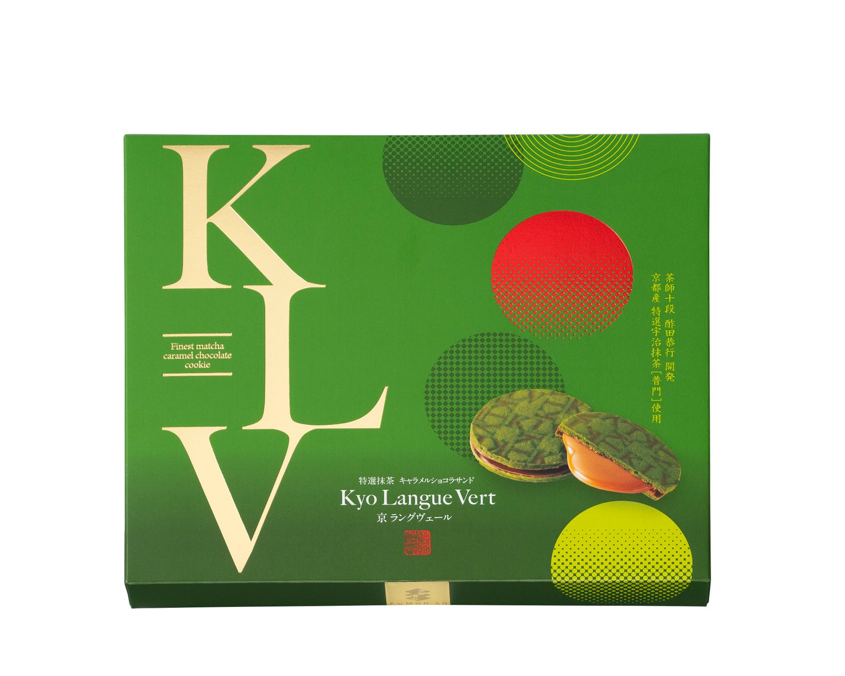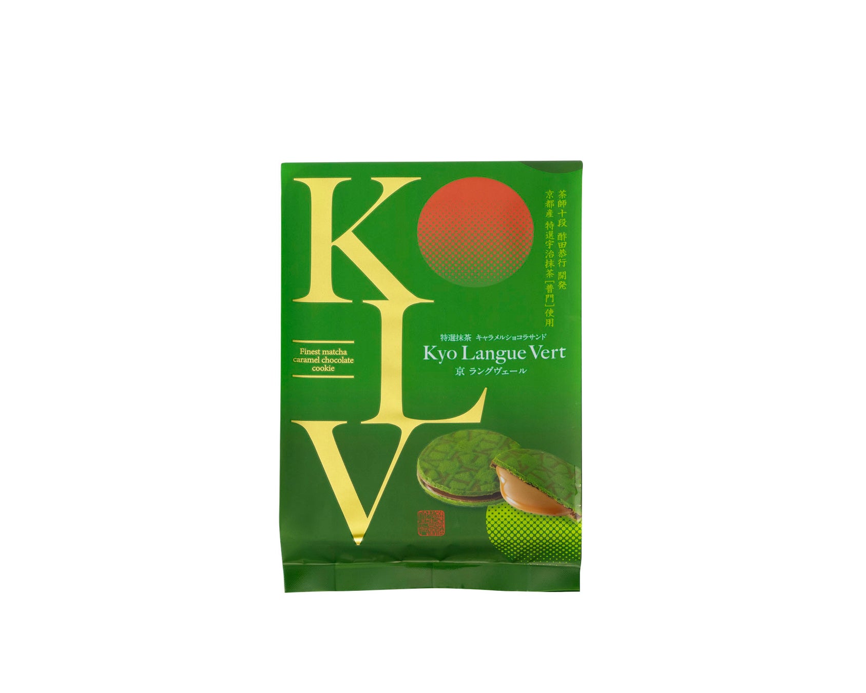 至高の特選宇治抹茶「普門」を贅沢に練り込んだ深緑のラングドシャ生地で、キャラメルショコラをサンドした「京ラングヴェール」。「ヴェール(Vert)」は、フランス語で“緑”を意味しており、京都府産特選宇治抹茶とフランス発祥のラングドシャが融合したお菓子です。生地に施したKLV(京ラングヴェール)の刻印は唯一無二の証。京都とフランスの粋を極めた抹茶の深い薫りとキャラメルショコラのマリアージュをお楽しみいただけます。