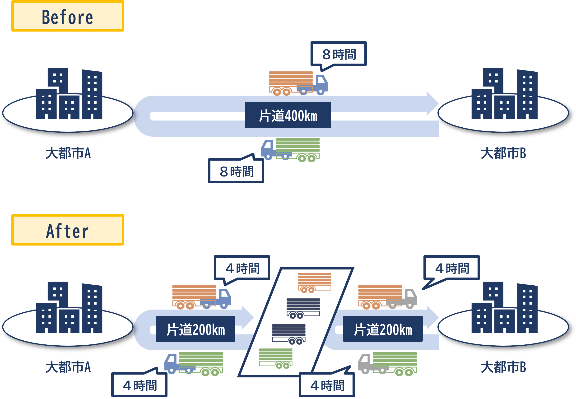しかしながら、現在の運送業界の配送スキーム、特に長距離輸送の運行方法では、2024年問題への対応で大幅なコストアップが見込まれ、運行方法の見直しが必須となっております。
