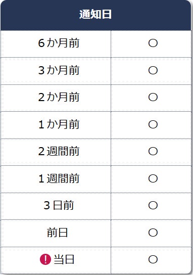 ・6ヶ月前から当日まで、きめ細かい通知間隔