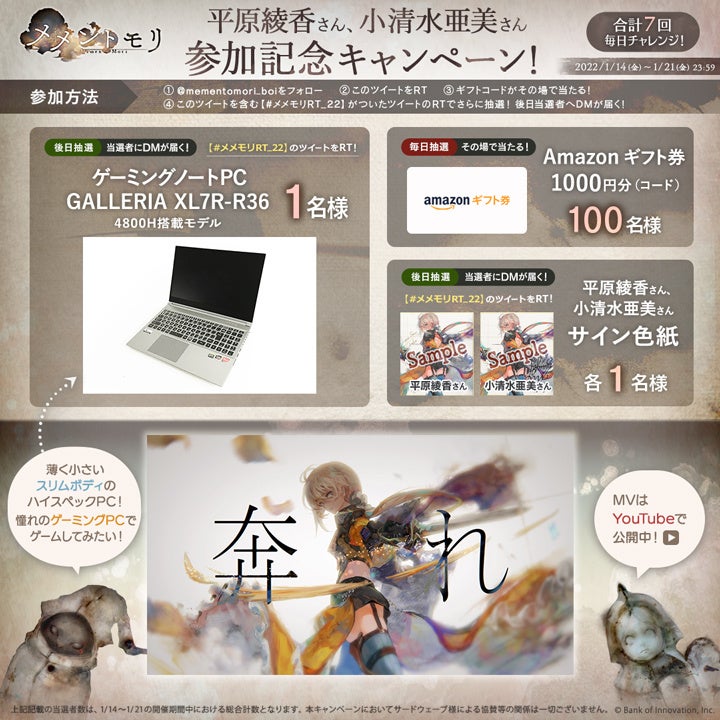 ◯応募方法:メメントモリ公式Twitterアカウント(@mementomori_boi)をフォローし、「#メメモリRT_22」がついた公式ツイートをリツイートすると、抽選で合計103名様に、Amazonギフト券コードやサイン入り色紙、ゲーミングノートPCが当たります。