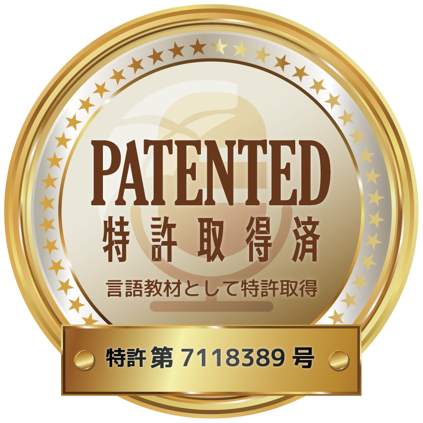 カラオケEnglishには、①色のついた文字を追って発話するカラオケ字幕システム ②「英語を聞く→声に出す→自分の英語を聞く→読む」という耳・口・目など異なる感覚器官を活用する学習サイクル ③瞬間英作文をしやすいように日本語訳の読点を英単語の区切りに対応させた工夫、など多くの特長があります。2022年7月に、それらが認められ、言語学習教材として特許を取得しました。