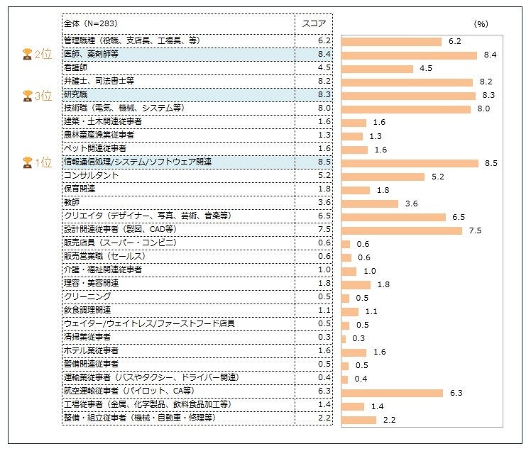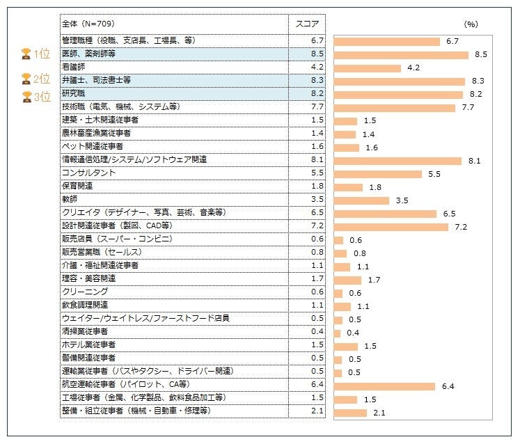 全体では1位「医師、薬剤師等」、2位「弁護士、司法書士等」、3位「研究職」という結果になりました。