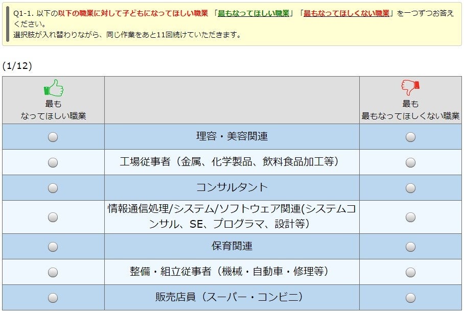 今回調査では業種を29項目抽出し、1画面につき7項目をランダムに呈示、その中から「最も子供になってほしい職業」と「最も子供になってほしくない職業」をそれぞれ1つずつ選択、それを12回繰り返し聴取しました。