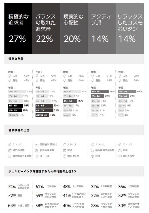 本レポートでは、回答者の価値観や健康・ウェルビーイングに対する姿勢、また彼らの食習慣に関するデータを基に、5つの主要な消費者セグメント-積極的な追求者(Proactive Pursuers)、バランスの取れた追求者(Balanced Seekers)、アクティブ派(Activity Seekers)、現実的な心配性(Practical Worriers)、リラックスしたコスモポリタン(Relaxed Cosmopolitans)-に分類しています。