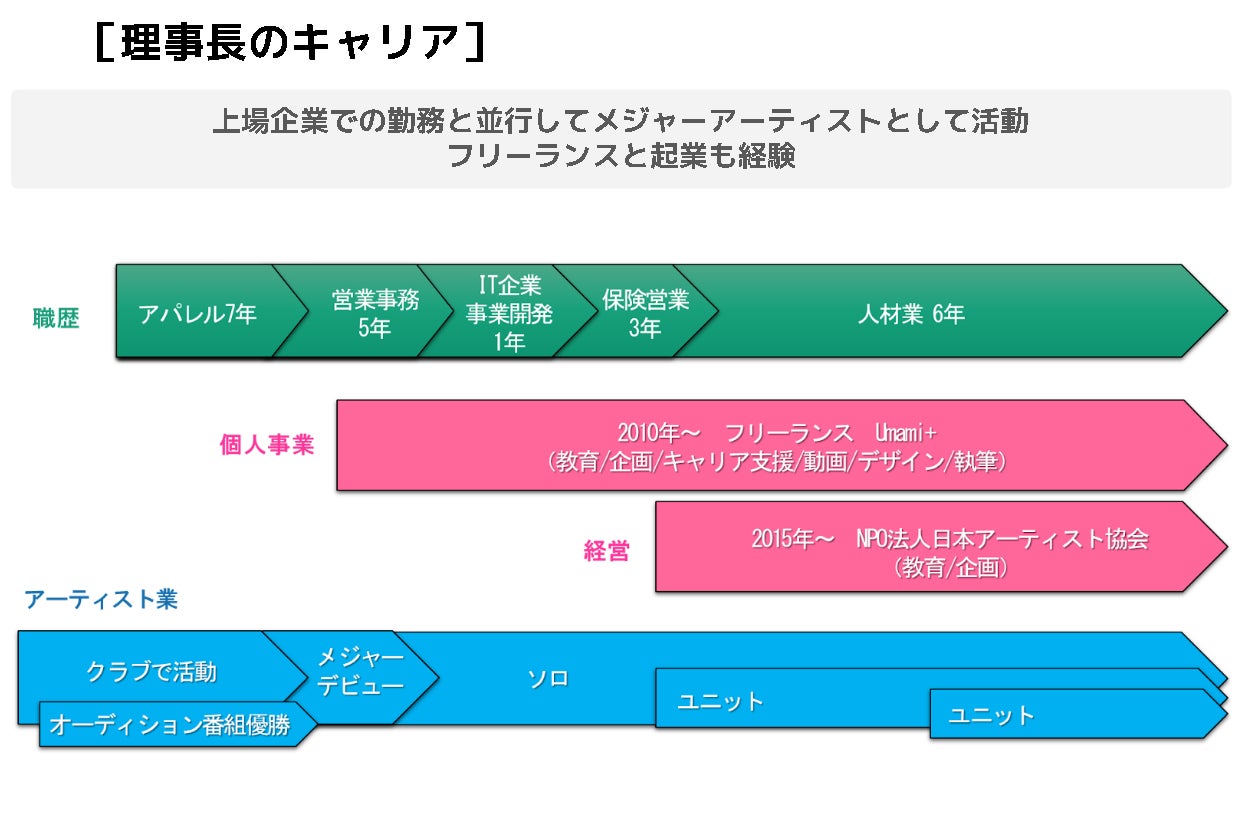 日本アーティスト協会は、人間性と継続的な活動に期待して契約を交わし、楽曲制作、アレンジ、アーティストプロデュース等の活動の支援、品質向上支援を行います。同時に、法人内の事業開発部に配属し、事業運営を通じてフリーランスとしてのキャリア形成支援も行います。