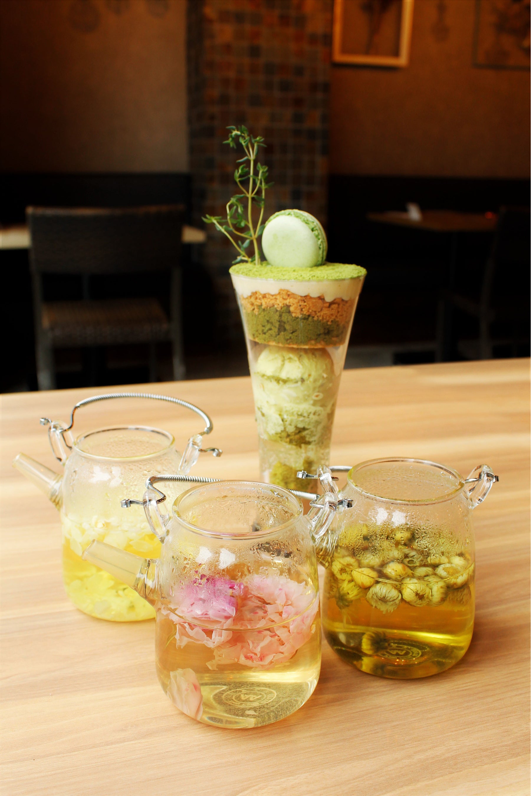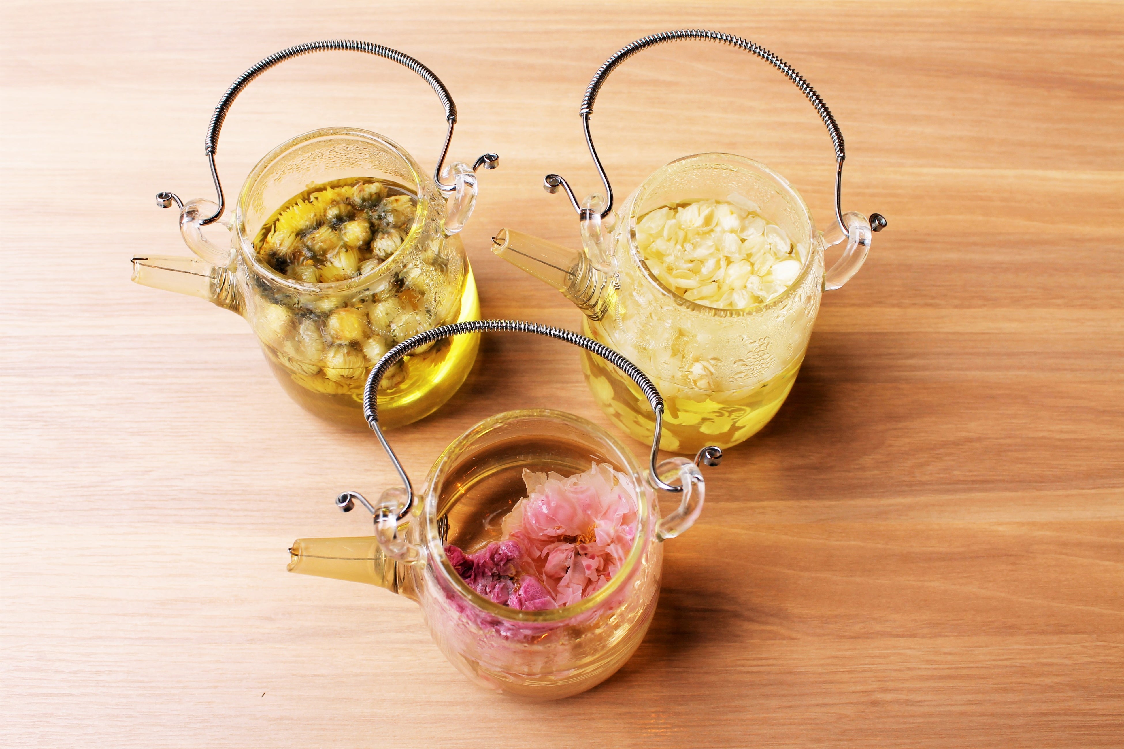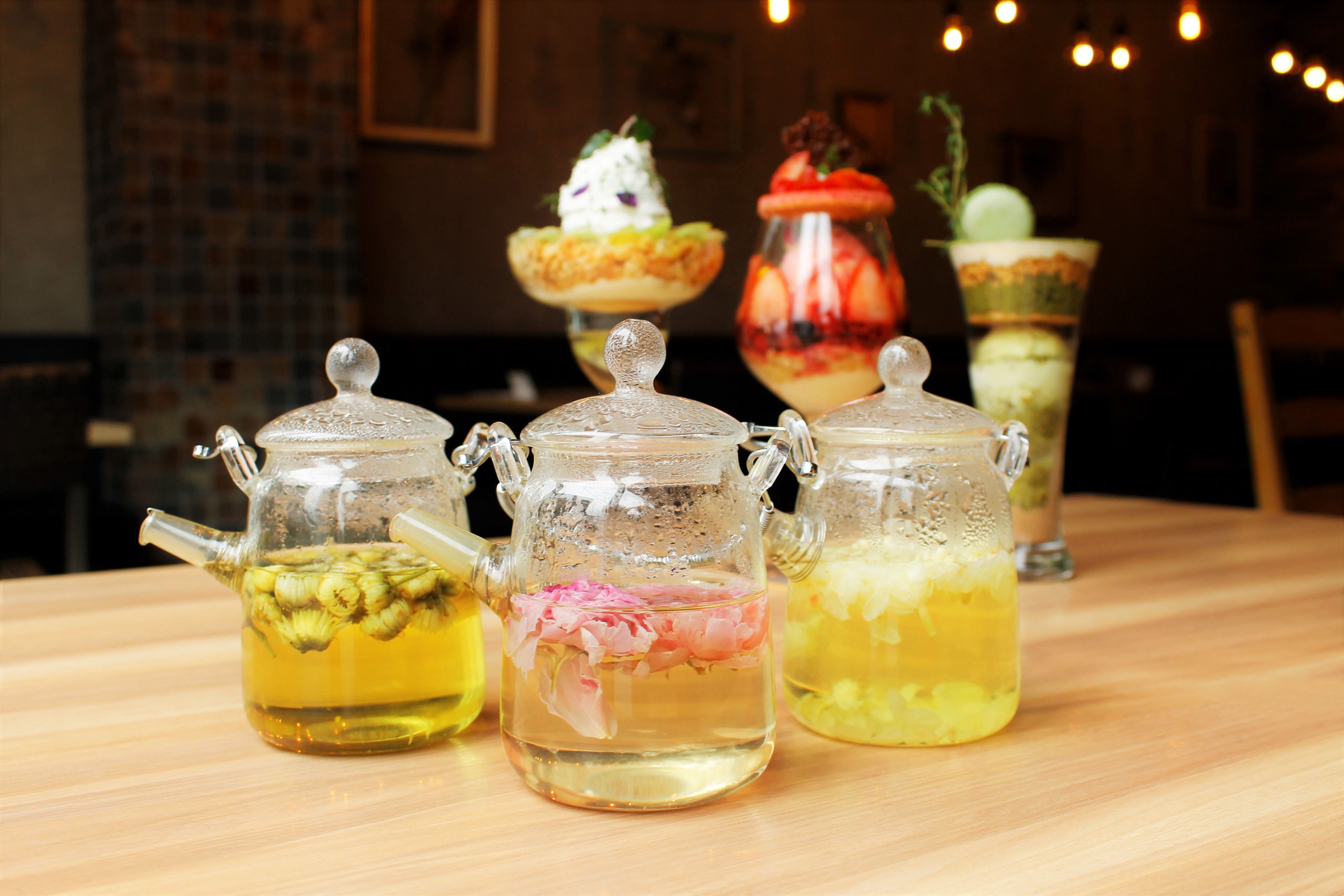 夜パフェにセットで用意されている花茶は「ばら花冠茶」「ジャスミン花茶」「菊花茶」の3種類。