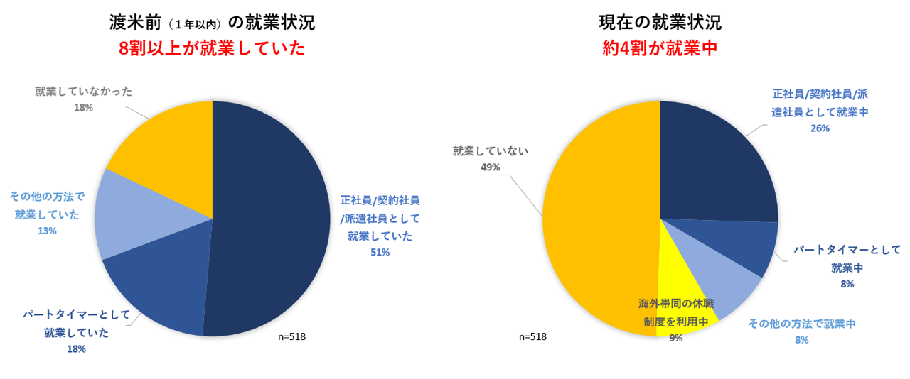 渡米前に就業していた人が82%に対し、渡米後何らかの形で就業している人は42%でした。現在働いていない人のなかには、海外帯同の休職制度を利用されている方も9%を占めています。