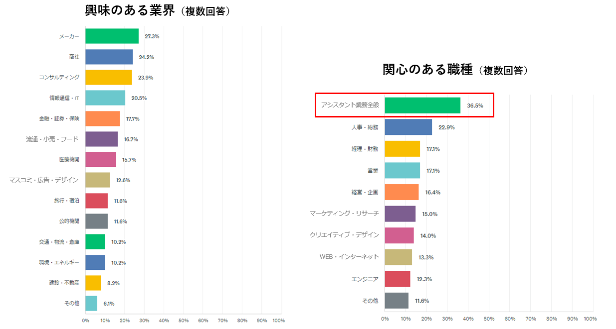 興味のある業界は多岐に渡り、関心のある職種は「アシスタント業務全般」が最多