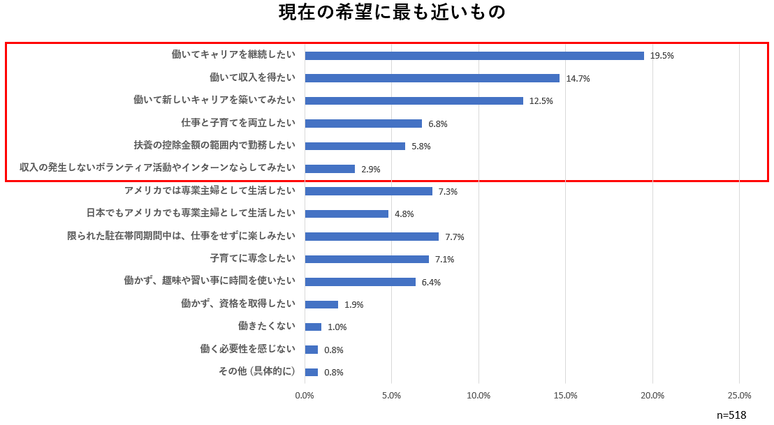 今回の調査で、子供を帯同している家族は85.33%を占めました。日本と異なり、アメリカでは一定年齢に達するまで学校の送迎を保護者が担う責任があるため、子供を帯同している家族には、時間的な制約が生まれます。また、夏休みは2か月ほどと長く、その間に日本へ一時帰国をする世帯も多く、帯同家族のアメリカでの就業にあたっては勤務形態のフレキシビリティが重要な要素を占めると考えられます。