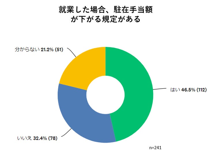 会社の規程で働くことが可能と回答した人のうち、就業した場合に駐在手当額が下がるという規定があると回答した人が46.5%、そのような規定はないと回答した人が32.4%と下回りましたが、帯同家族の就業に対しては、企業の対応に差があることが伺えます。