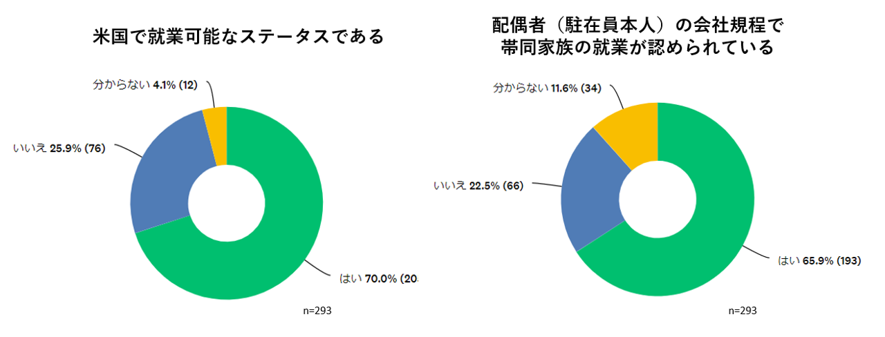 ビザのステータスの問題で働けない、というケースもあり得るため、その点についても聞いてみました。就業希望者のうち、70%が就業可能なステータスであり、また、配偶者(駐在員本人)の会社規程で帯同家族の就業が認められているケースは65.9%を占め、外的要因で働けない人は30%以下にとどまりました。