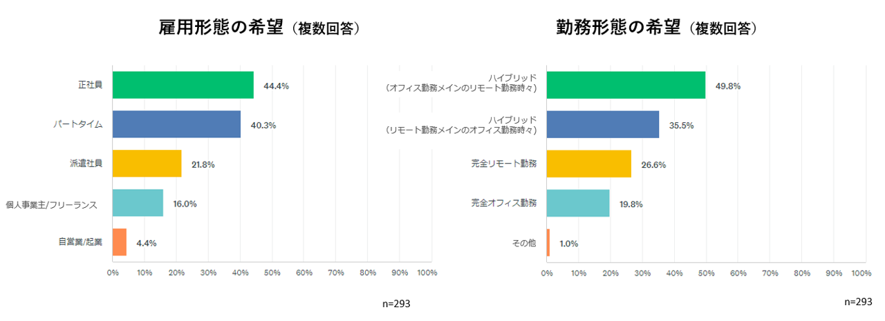アメリカでの理想の働き方は、正社員(44.4%)、パートタイム(40.3%)の雇用形態が最多で、勤務形態は昨今のアメリカ労働市場のトレンドに倣う形で、オフィス勤務メインのハイブリッド(49.8%)、リモート勤務メインのハイブリッド(35.5%)、完全リモート勤務(26.6%)でした。