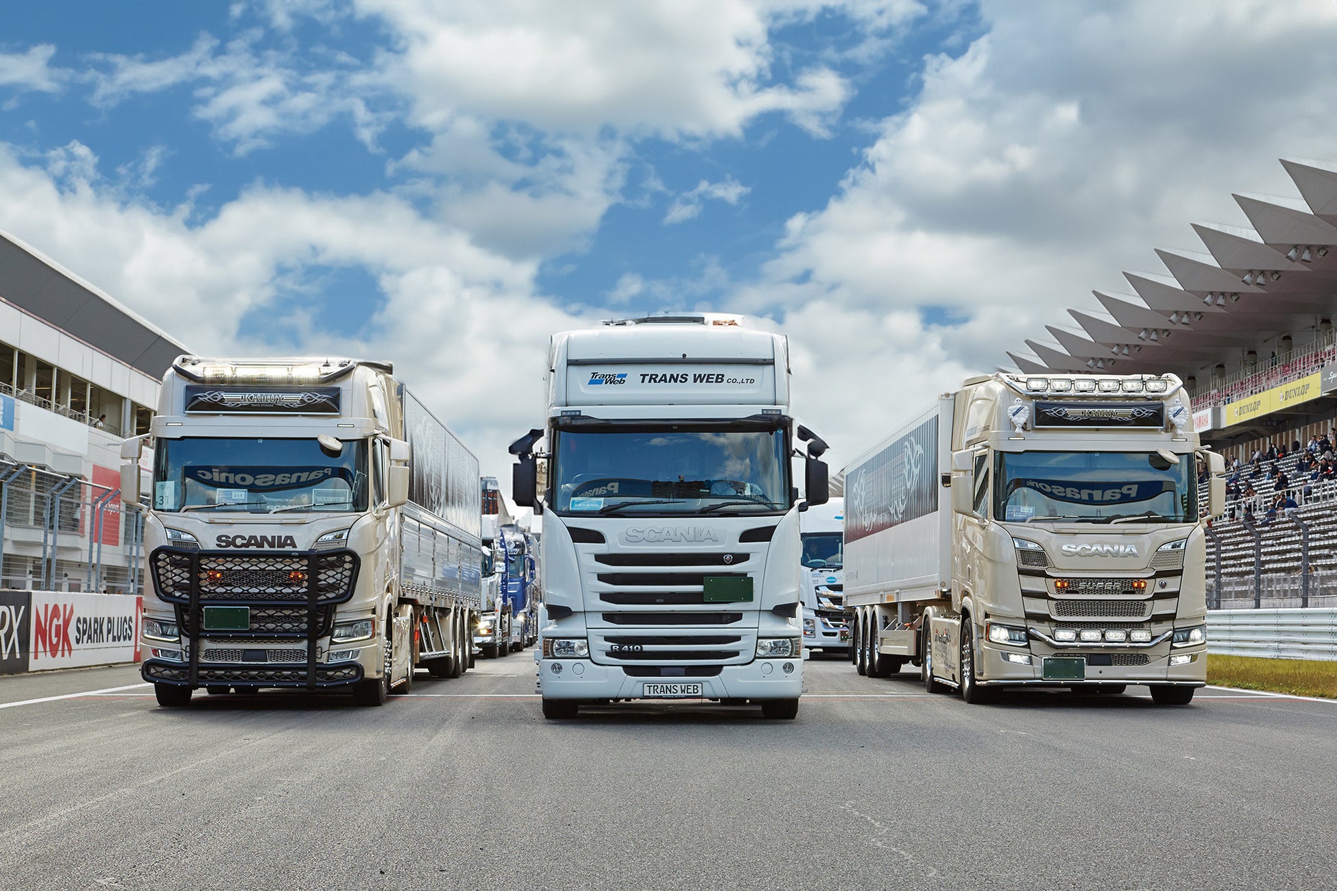 トラックやトレーラーがレーシングコースを悠々と走行します。