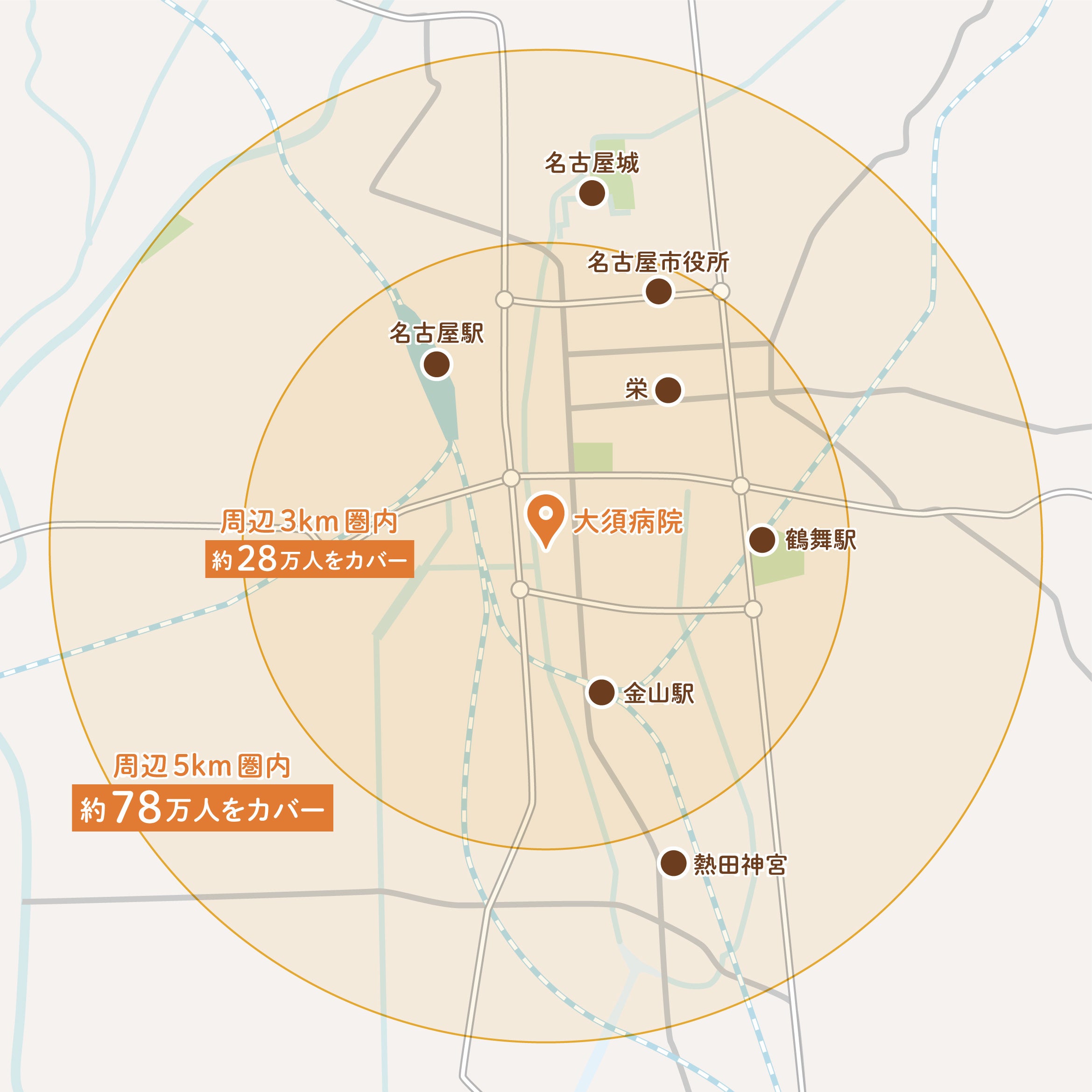 大須病院が位置する名古屋市中区は、人口密度が高く、医療需要も高いエリアです。周辺3km圏内には名古屋駅周辺や金山エリア、鶴舞エリアまで含まれ、人口は約28万人です。さらに周辺5km圏内まで含めると、名古屋城周辺や熱田神宮のエリアまで含まれ、人口約78万人規模の医療圏となります。大須病院は、全国の中でも医療需要の高い名古屋市の中心エリアにおいて、どの地域へのアクセスしやすいロケーションです。