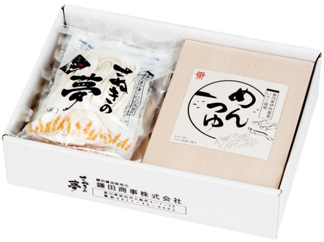 香川県産小麦「さぬきの夢2009」を100%使用した生うどんと、香川県伊吹島産いりこを100%使用しためんつゆがセットになった鎌田商事の冬季限定商品です。