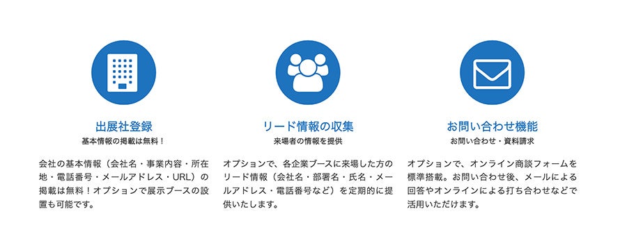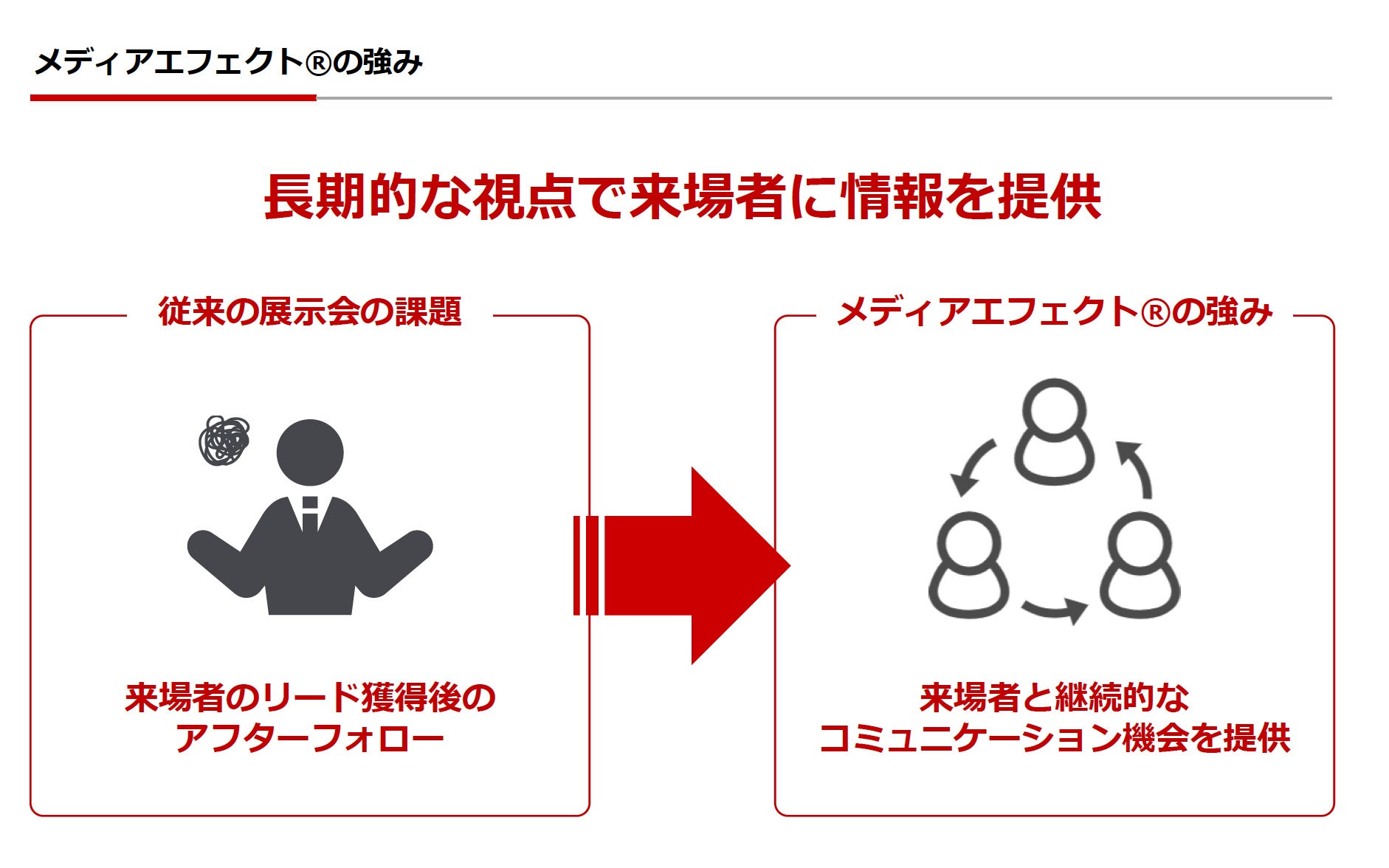 これまでのリアルイベントやオンライン展示会とは異なり、オンラインの強みを活かした長期的な視点で出展社と来場者の関係構築を強化するメディア一体型のオンライン展示会プラットフォームです。
