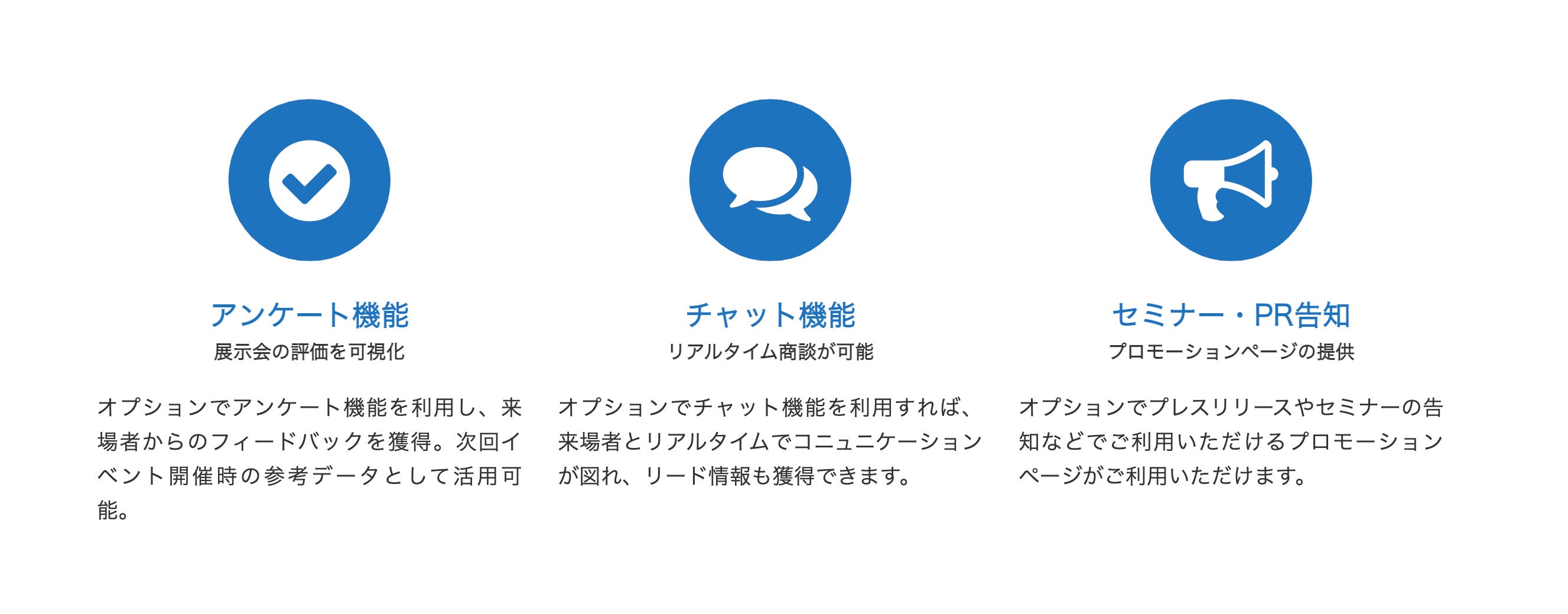 オンライン商談フォームやアンケートフォームの設置で後⽇商談につなげたり、チャットを利⽤することでリアルタイムで来場者リストを確認しながら、来場者への声かけや個別商談を開始することが可能です。