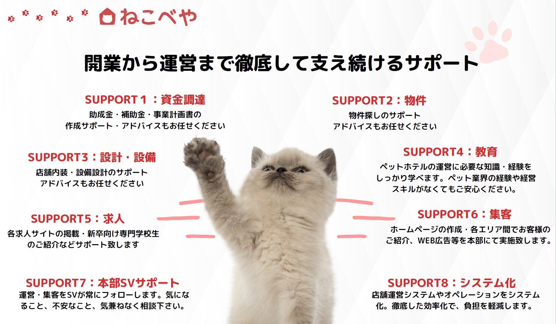 猫との共生は多くの人々にとって大きな喜びであり、猫の飼育数は年々増加の一途をたどっています。この増加する需要に応えるため、株式会社ペチカは猫専門の個室ペットホテル「ねこべや」とキャットサロン「ねこべやサロン」を運営しています。これまでに直営7店舗、フランチャイズ6店舗を成功させ、今回の募集は更なる地域拡大を目指します。