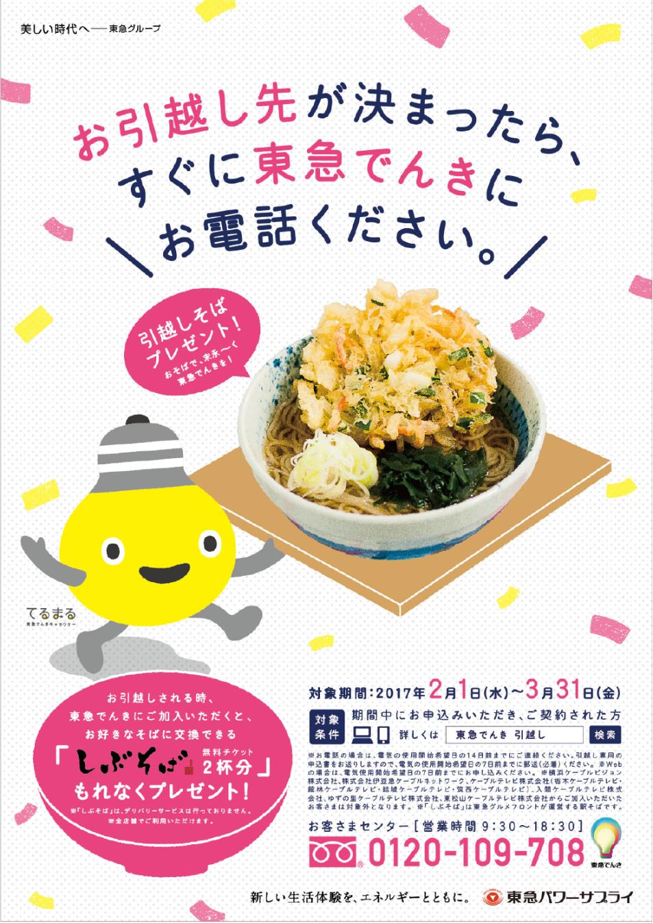 本キャンペーンでは、期間中にお引越し先の電気を東急でんきでお申し込みいただき、2017年6月30日(金)までに供給開始した方を対象に、株式会社東急グルメフロントが東急線沿線を中心に10店舗を展開する駅そば「しぶそば」の全店舗で使える無料チケット2杯分をもれなくプレゼントいたします。
