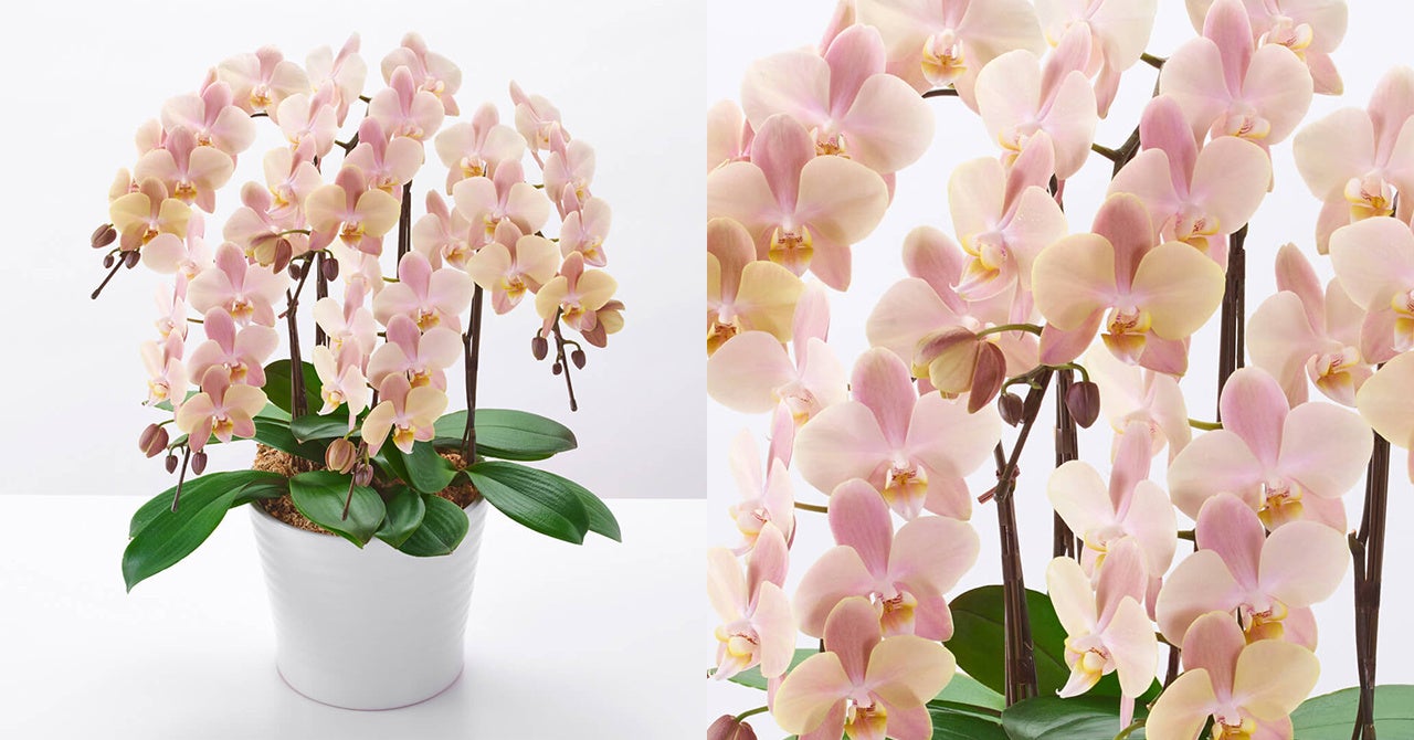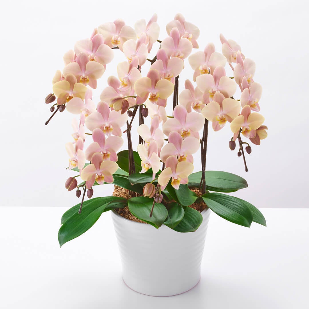黄色味のあるベージュからピンクがかったベージュへの、繊細な花色の変化が特徴のミディ胡蝶蘭です。花もちがよく、長い期間美しい花を楽しめます。