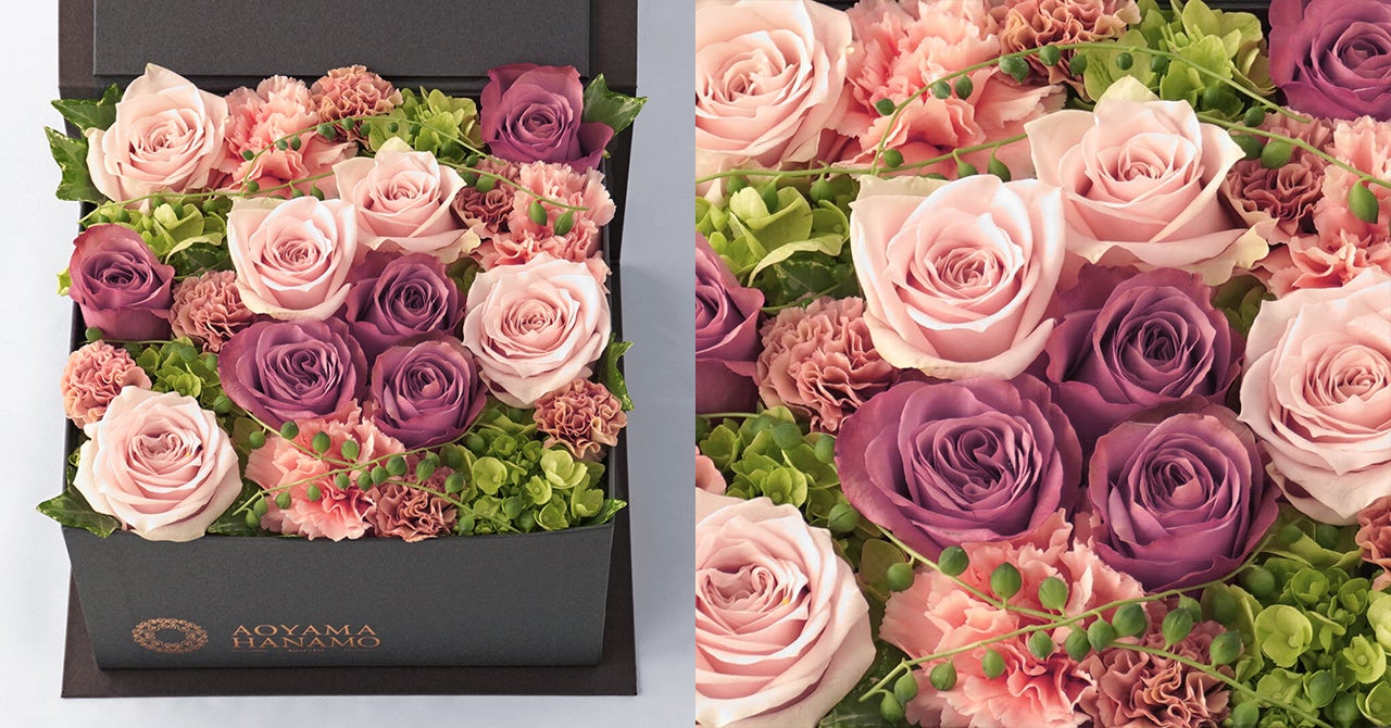 一輪一輪を美しく魅せることを心がけてデザインした、ボックスアレンジメント。パープルと淡いピンクの2種の大輪バラを中心に、淡いピンクのカーネーションなどを合わせた穏やかな花色合わせのデザインです。