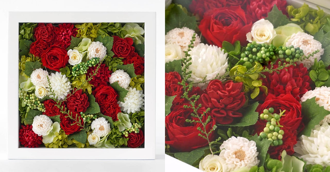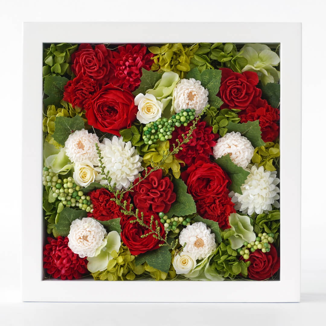 白いフレームボックスに、赤いバラやカーネーション、白いスプレーバラなどを配したプリザーブドフラワー。絵画のように壁にかけて飾ったり、そのまま立てかけたりしてお楽しみいただけます。