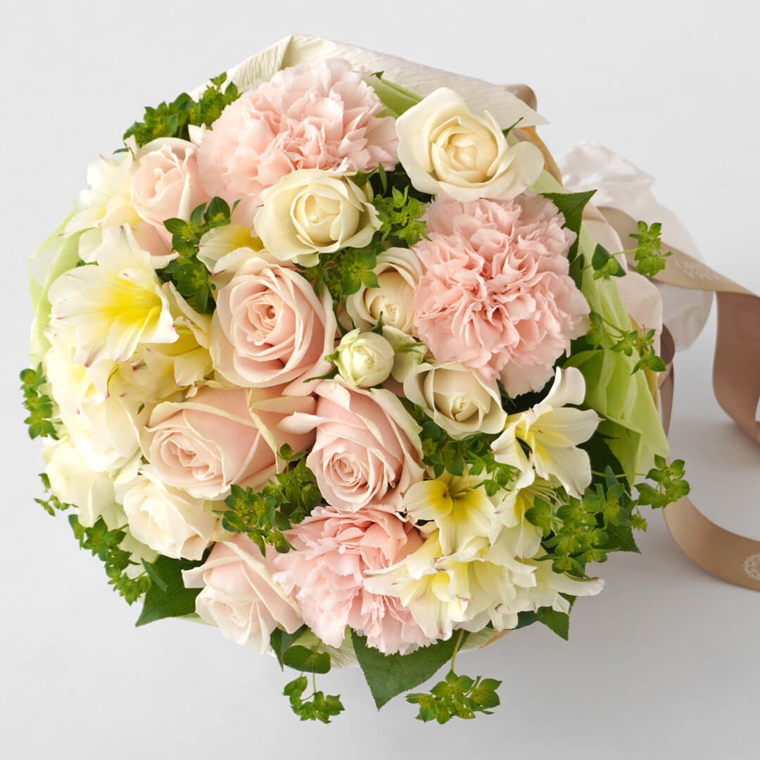 淡いピンクの大輪バラやカーネーションに、クリーム色のスプレーバラなどでお作りしたラウンドスタイルブーケ。陽だまりのような優しい色合いの花束は、いつも明るいお母さまにぴったりのデザインです。