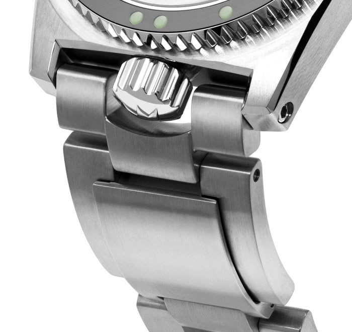 1970年、ZRCは、ラグの間のスペースに特化した独自の格納式エンドピースを開発しました。これにより完全にねじ込まれていない状態のリューズでは、エンドピースの凹部に収納することができません。つまりリューズがねじ込まれていないと、ブレスレットを正しく装着することができないということです。またブレスレットは、2つの伸縮リンクを備えている点でも独創的であり、ダイビングスーツの上からでも調整なしで時計を着用できます。超発光のマグナム針により、水中での完璧な視認性が確保されます。