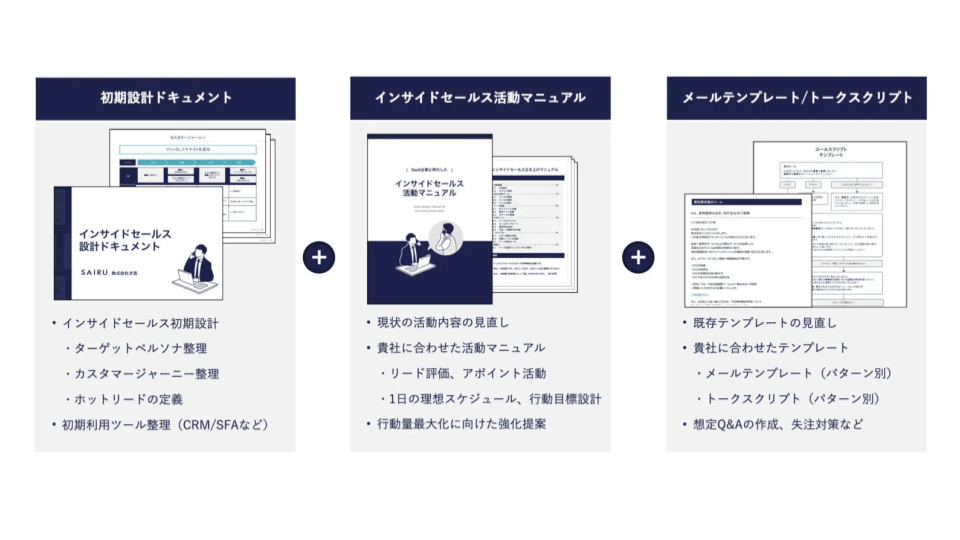 インサイドセールスの立ち上げに必要な「初期設計」「活動マニュアル」「メールテンプレート・トークスクリプト」を通常3か月で作成。メソッドをもとに、業務設計から実行・オペレーションまで、成果の出るインサイドセールスを0から迅速に立ち上げます。