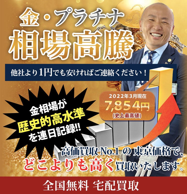 世界情勢の逼迫により金価格が異例の高騰。東京池袋に店舗を構える買取専門店「リファスタ」では金プラチナ等の貴金属を高価買取いたしております。