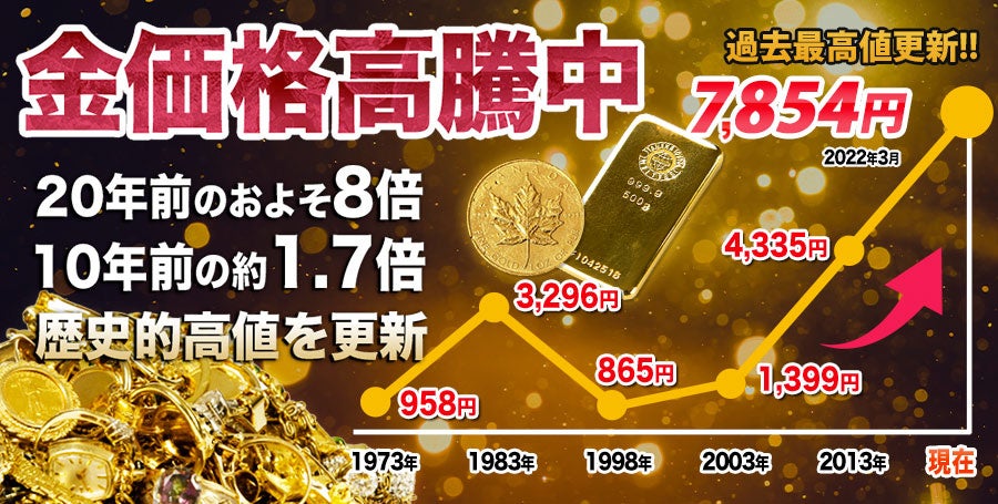 2022年3月4日、金価格が【7,854円】を記録し歴代最高値を更新しました。1,000円前後を推移していた2000年ごろから比較するとその価格は言うに7~8倍。過去30年間の最低価格『865円』1998年から比べるとおよそ9倍。