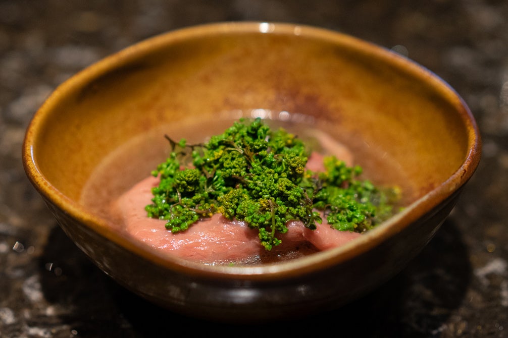 佐賀⽜の雌⽜のサーロインを使⽤し、脂・スジを全掃除した霜降りの⾚⾝の部分のみを使⽤し低温の出汁でロゼ⾊になるまでしゃぶしゃぶします。花⼭椒の⾹りを引き出した和出汁と共に楽しめる⼀品。